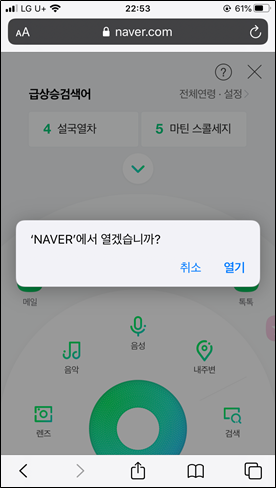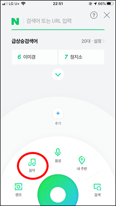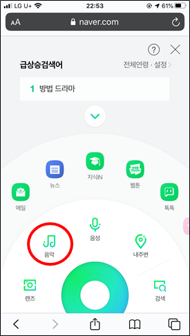 Naver App으로 네이버를 접속하면 다음과 같이 음악을 찾을 수 있는 기능이 있다.