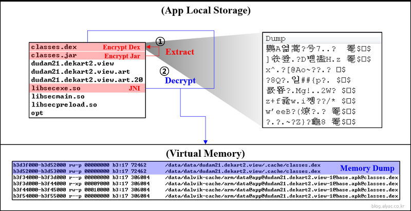 랩퍼 애플리케이션이라고 불리는 B 애플리케이션은 A 애플리케이션을 암호화하여 저장하고 있다가 프로그램을 시작하면 A의 실행 파일에 해당하는 .dex 또는 apk 파일 또는 .jar 파일을 복호화하여 실행한다.