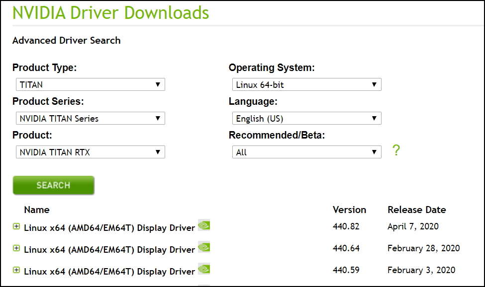 우리의 GPU 모델은 NVIDIA TITAN RTX 이므로 Version은 440을 사용하면 된다.